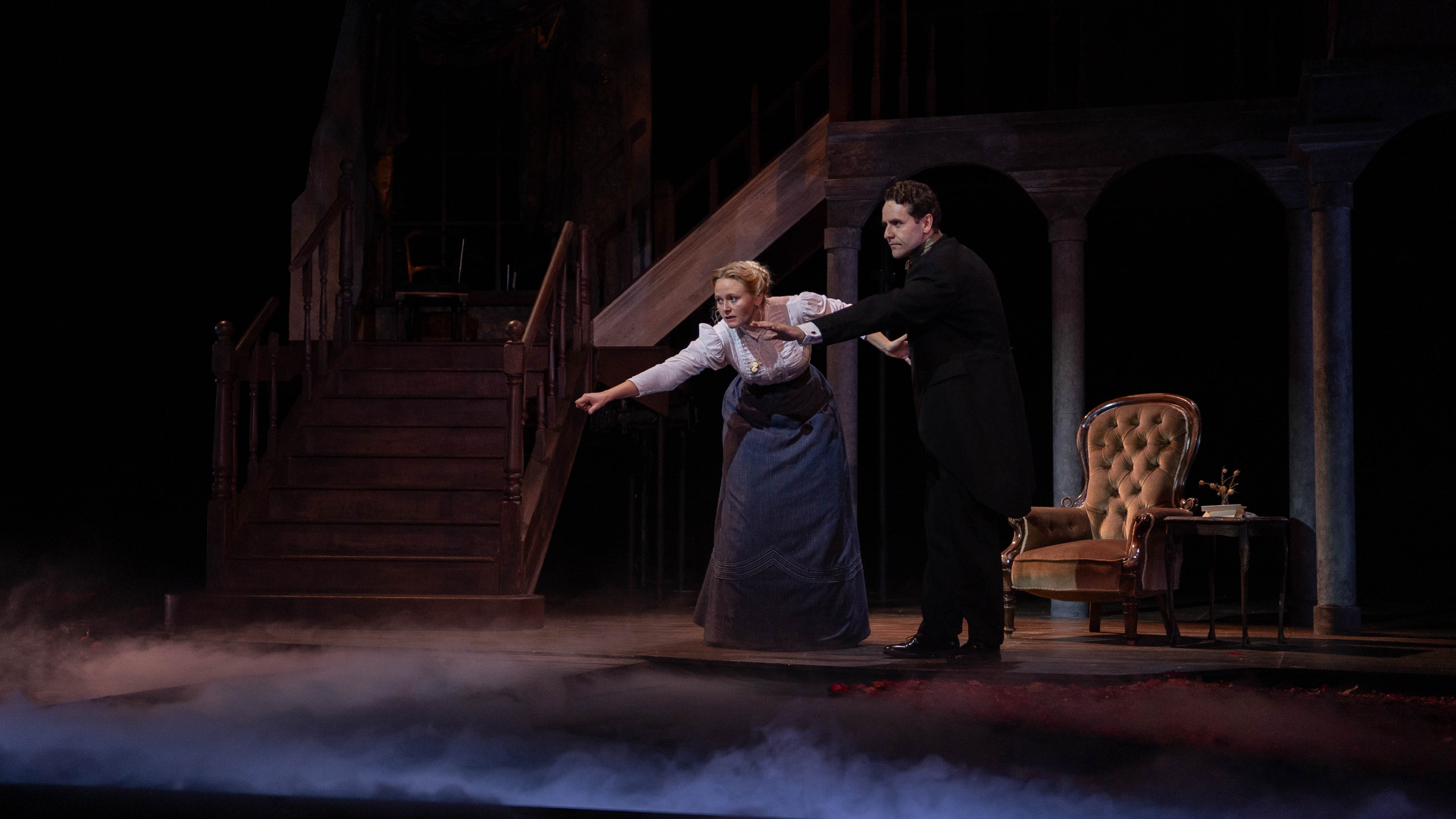 Mae dyluniad y set (Ruth Stringer) yn drawiadol, ac yn ein trochi i mewn i dŷ Bly, ynghyd â grisiau wedi'u torri, ffenestr uchel wedi'i gorchuddio â llenni trwm a drws ar ddiwedd y glanfa. Ar flaen y tŷ a'r llwyfan, mae dyfroedd llonydd llyn a glannau'r ardd yn dod â'r stori'n fyw. Yn y pellter mae'r tŵr wedi'i oleuo'n rhannol ac mae cymylau'n pwffian ar draws llinell lygad y gynulleidfa wrth i'r nos ddisgyn. Mae'r olygfa weledol hon yn ein hamgylchynu, gyda disgwyliad llawn, wrth i gerddoriaeth chwarae a'r ystafell gael ei phlymio i dywyllwch.