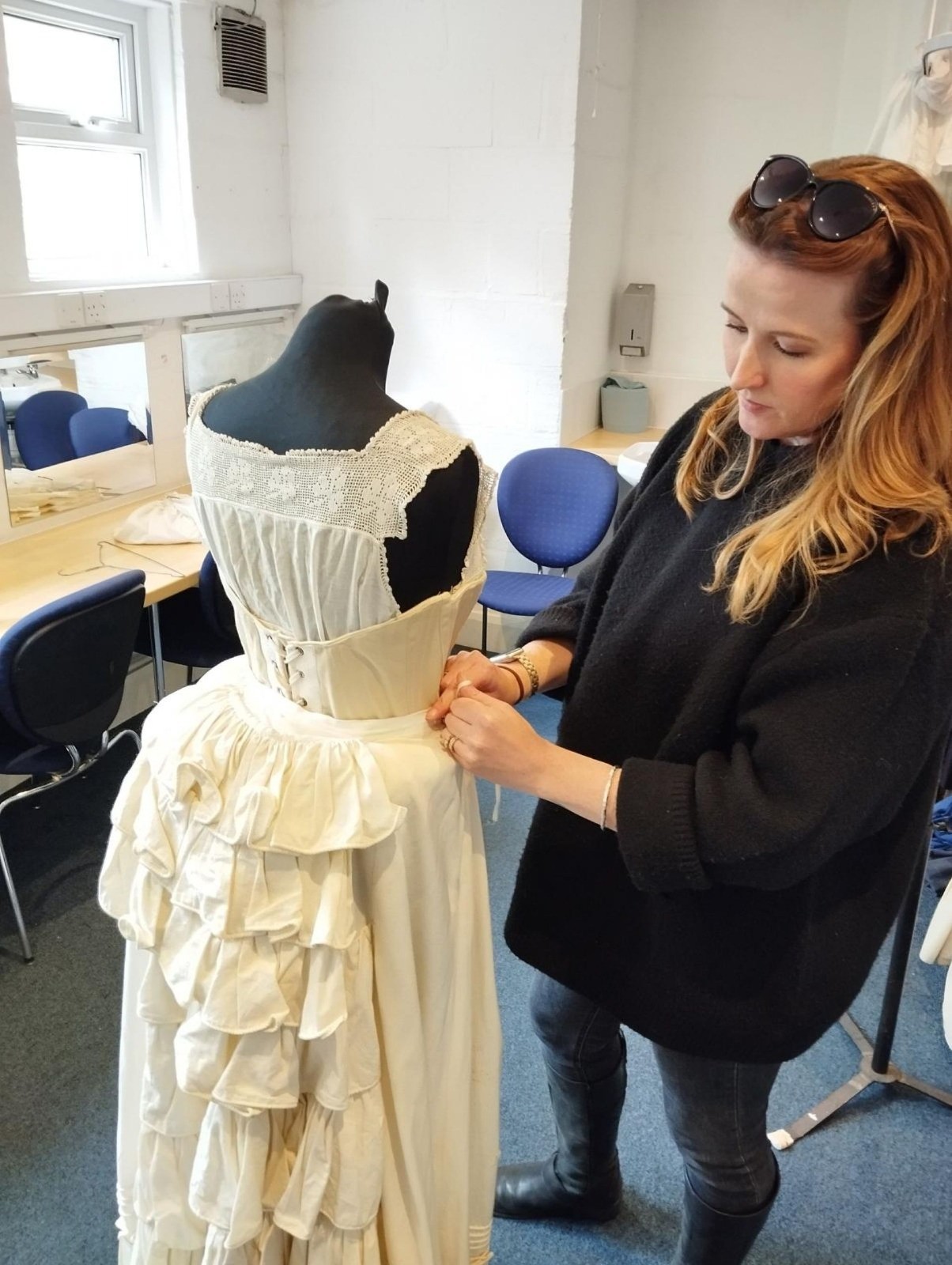 “Ar ôl gweithio ym maes gwisgoedd ers nifer o flynyddoedd roedd eisoes gen i wybodaeth dda am wisgoedd hanesyddol, ond mae bob amser yn ddoeth gwneud ymchwil pellach o bryd i’w gilydd. Rwy’n hoffi edrych ar lyfrau ffasiwn hanesyddol, ac mae gen i lawer ohonynt - gyda ffotograffau neu brintiau gyda disgrifiadau gwych o ddillad yn dweud wrthych chi’r rheswm dros newidiadau mewn ffasiwn, ac eraill sy’n astudiaethau o ddillad hanesyddol, gyda brasluniau o sut maen nhw wedi’u gwneud a phatrymau ar sut i’w hail-greu’n gywir. Rwy’n credu ei bod hi’n bwysig wrth weithio ar gynhyrchiad cyfnod i fod mor agos at gywirdeb â phosibl. Mae ymchwil yn allweddol.”