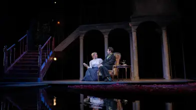 The first thing that struck me was the incredible set, designed by Ruth Stringer. To be honest, I still get as excited seeing the set design for each new play as I did when I was a little girl. I remember being so impressed when I first saw a two storey set over 40 years ago! In this production, the stage transformed into the inner house and its gardens, with actual water shimmering across it — such a clever, haunting touch. I was mesmerized even before the show had begun. The set itself focused on the interior spaces, but the cast’s vivid descriptions of the exterior — the grand house, the sweeping grounds, and the towering trees — brought the world beyond the stage to life. Dramatic lighting set the mood from the Governess optimistically hoping for a brighter, wonderful house to live and work at to a darker more sinister side. You could almost see the fog curling around the windows and feel the chill of the night air outside.